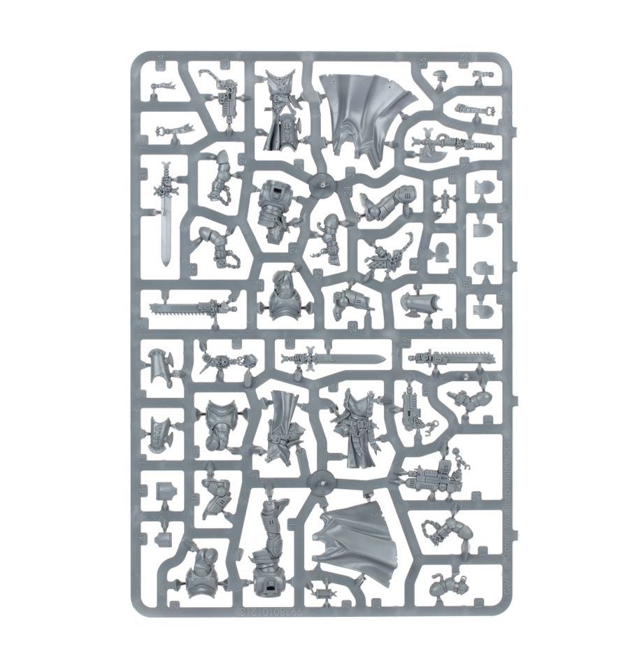 These veteran warriors battle with a mix of melee and ranged weapons. They are lead by a Castellan who can be equipped with a master-crafted power sword or Astartes chainsword in their right hand and a heavy bolt pistol, auto-plasma, or skull relic in their left. The four remaining Sword Brethren can be constructed with a mix of weapons, including a heavy bolt pistol, pyre pistol, plasma pistol, Astartes chainswords, power swords, power maul, power axe, a set of paired lightning claws, or a thunder hammer. This kit also comes with a range of unique heads, backpack finials, and various tilting plates.