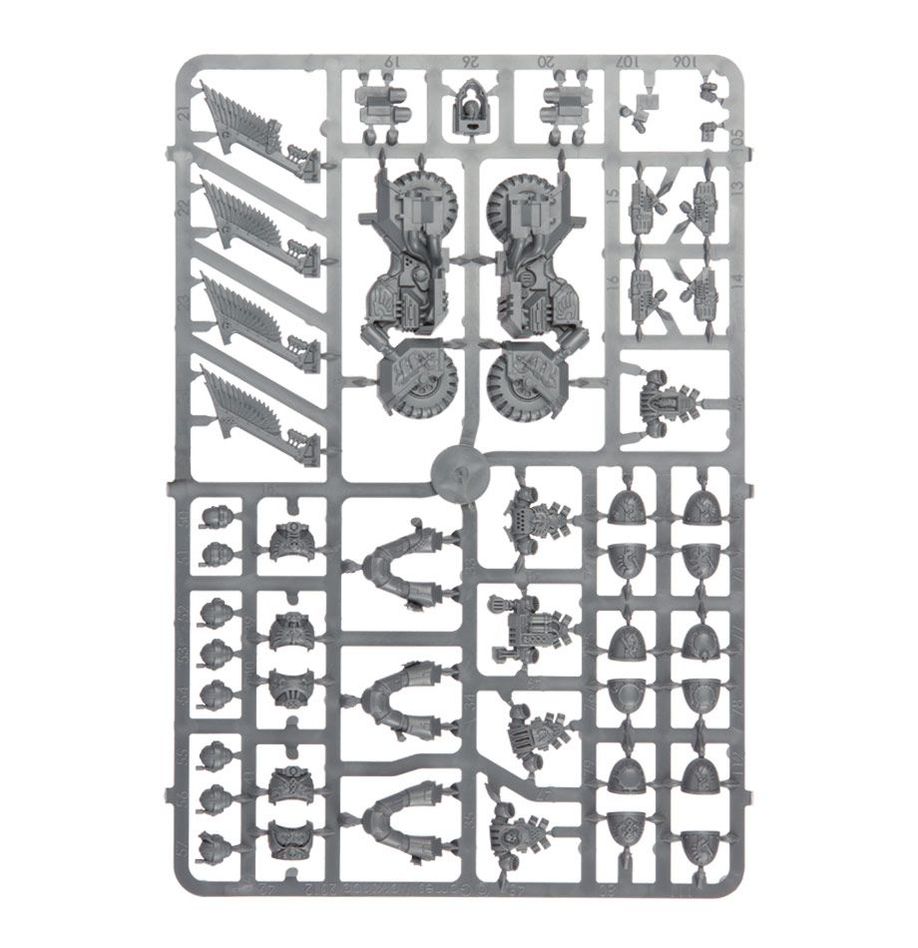 This kit is comprised of 122 plastic components with which to make a unit of three Ravenwing Black Knights. It is also supplied with a Dark Angels Transfer Sheet, and 3x Citadel 75mm x 41.5mm Oval Bases.