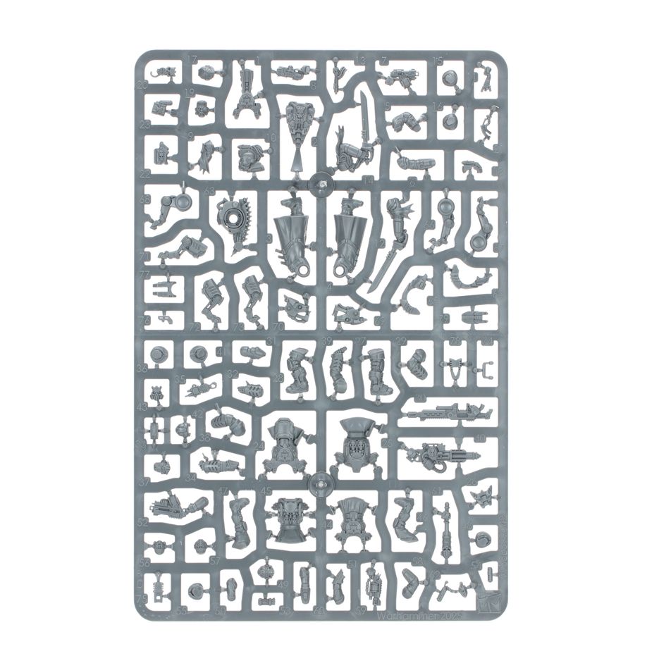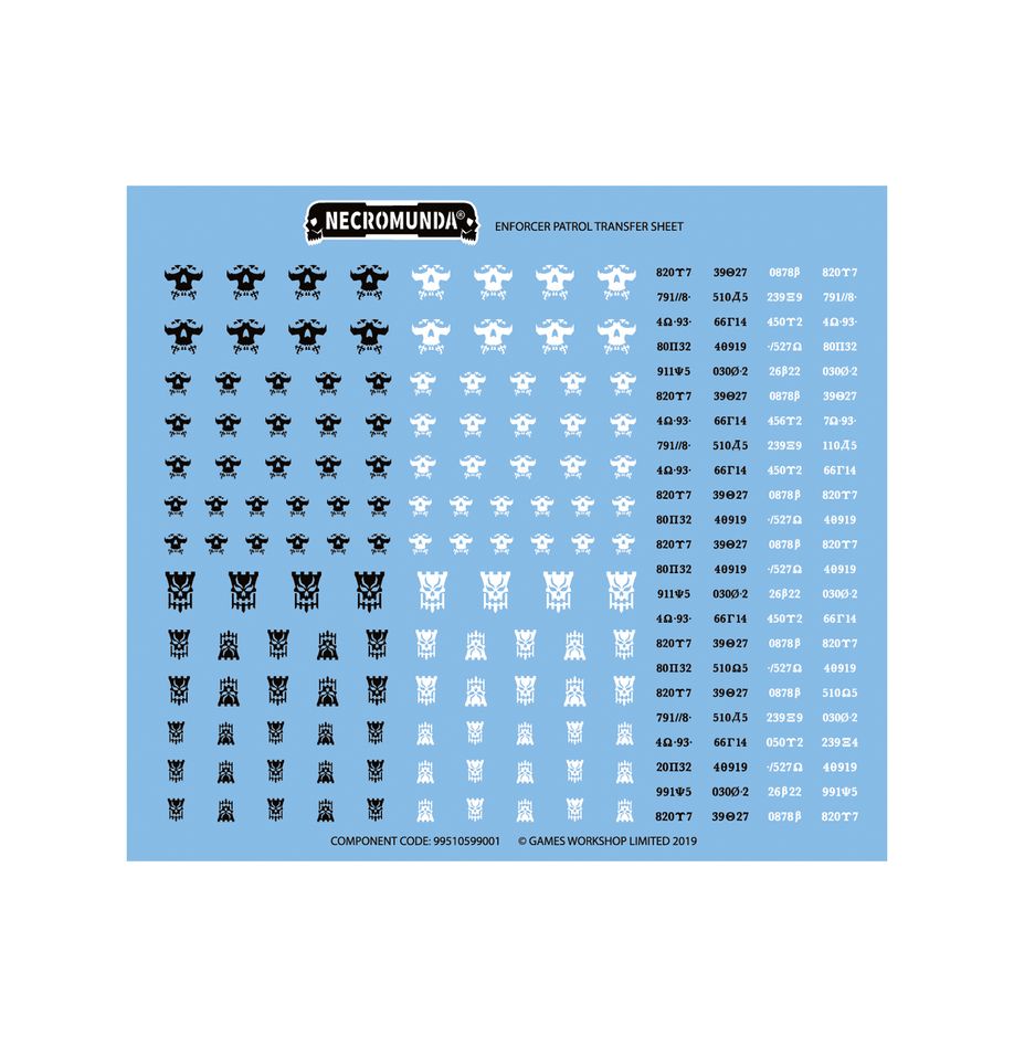 The kit comprises 158 plastic components, 2x Necromunda 25mm Round Bases, 6x Necromunda 32mm Round Bases, and 1x Enforcer Patrol Transfer Sheet containing 220 high-quality waterslide transfers to decorate your miniatures.