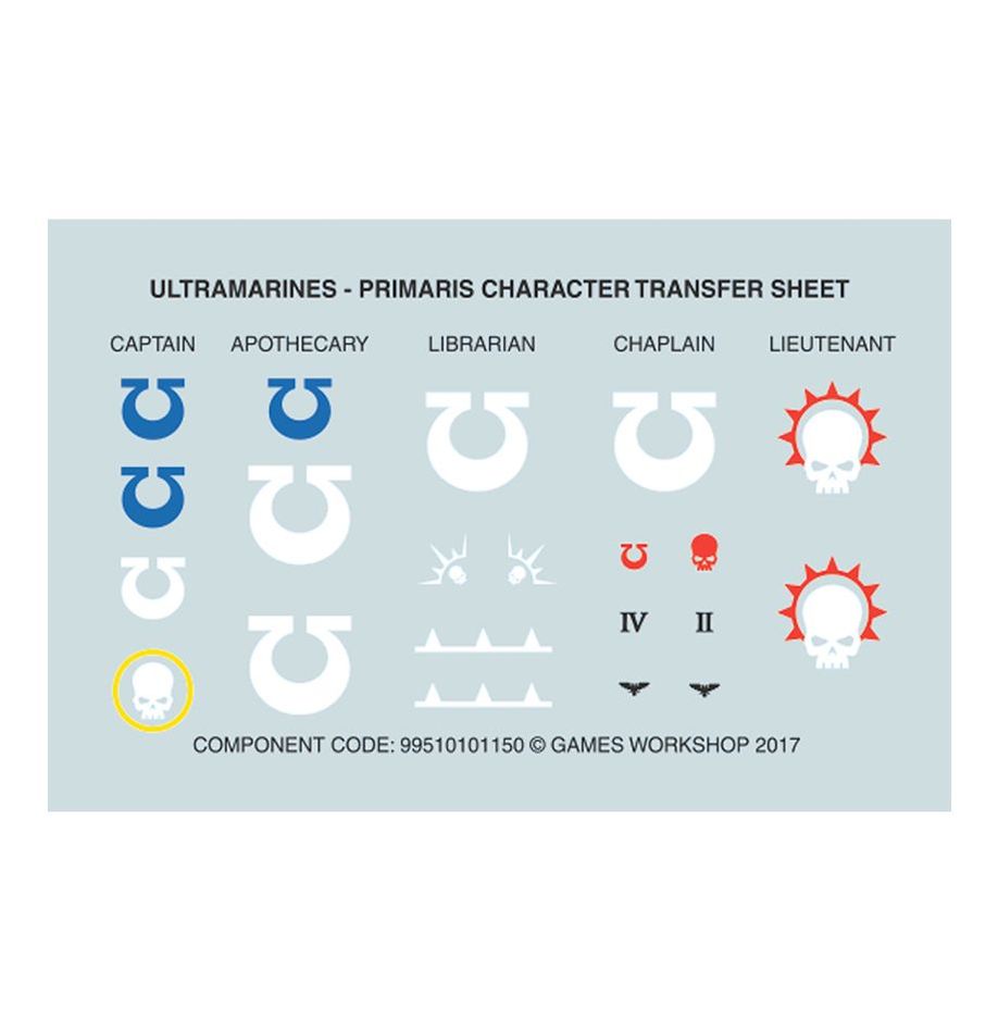 The Apothecary comes as 28 components, and is supplied with a Citadel 40mm Round base. The kit also includes a Ultramarines-Character Transfer Sheet, which features Captain, Chaplain, Librarian and Lieutenant iconography.
