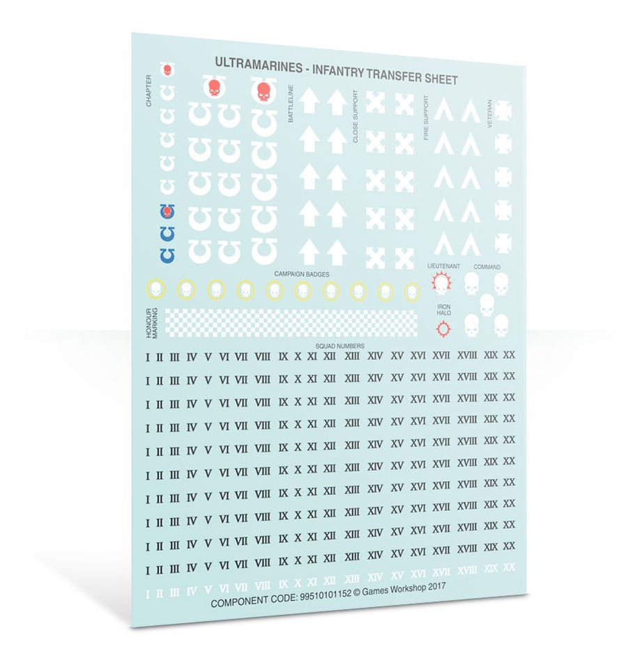 Five Purity Seals, two Servo Skulls, a pile of spent shells, a skull base piece, ten Space Marine targeting helmets, six sets of legs, six Sergeant hands and eight Space Marine shoulder pads round out this immense collection of components.